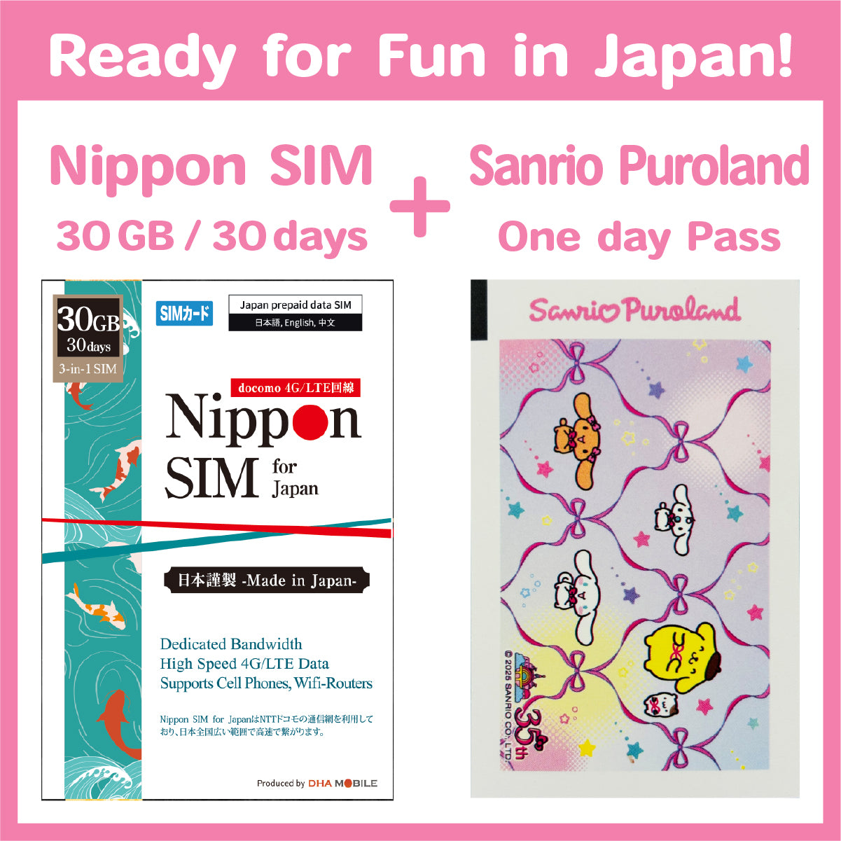 【방일 여행객 한정】산리오 퓨로랜드 데이 패스포트 + [Nippon SIM] 일본 | 30GB / 30일 | docomo 회선 | 선불 SIM카드